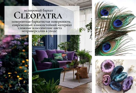 Новая коллекция бархатного микровелюра Cleopatra сочетает в себе всю изысканность и привлекательность бархата с высокими показателями и простым уходом современного микровелюра. Обширная палитра коллекции состоит из 10 глубоких вибрирующих чистым цветом оттенков. Кажется, все многообразие оттенков павлиньего пера собрались в цветовой гамме коллекции.